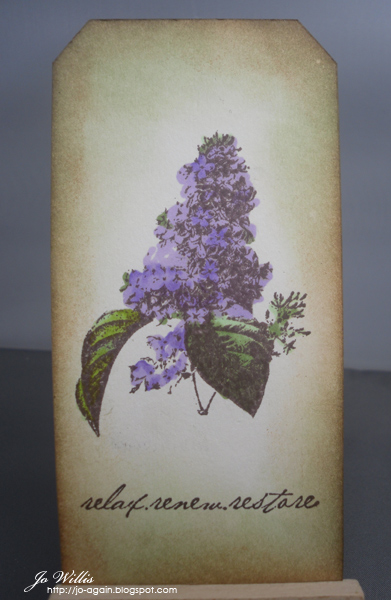 The first tag has been stamped with brown Memento ink and then coloured with Promarkers: